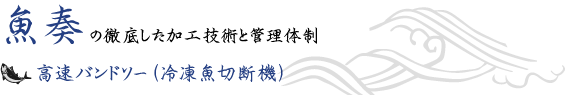 超低温の冷凍庫から出された魚を加工する高速カッター。主に冷凍マグロの加工に使われます。顧客のニーズに応えたさまざな加工が可能です。